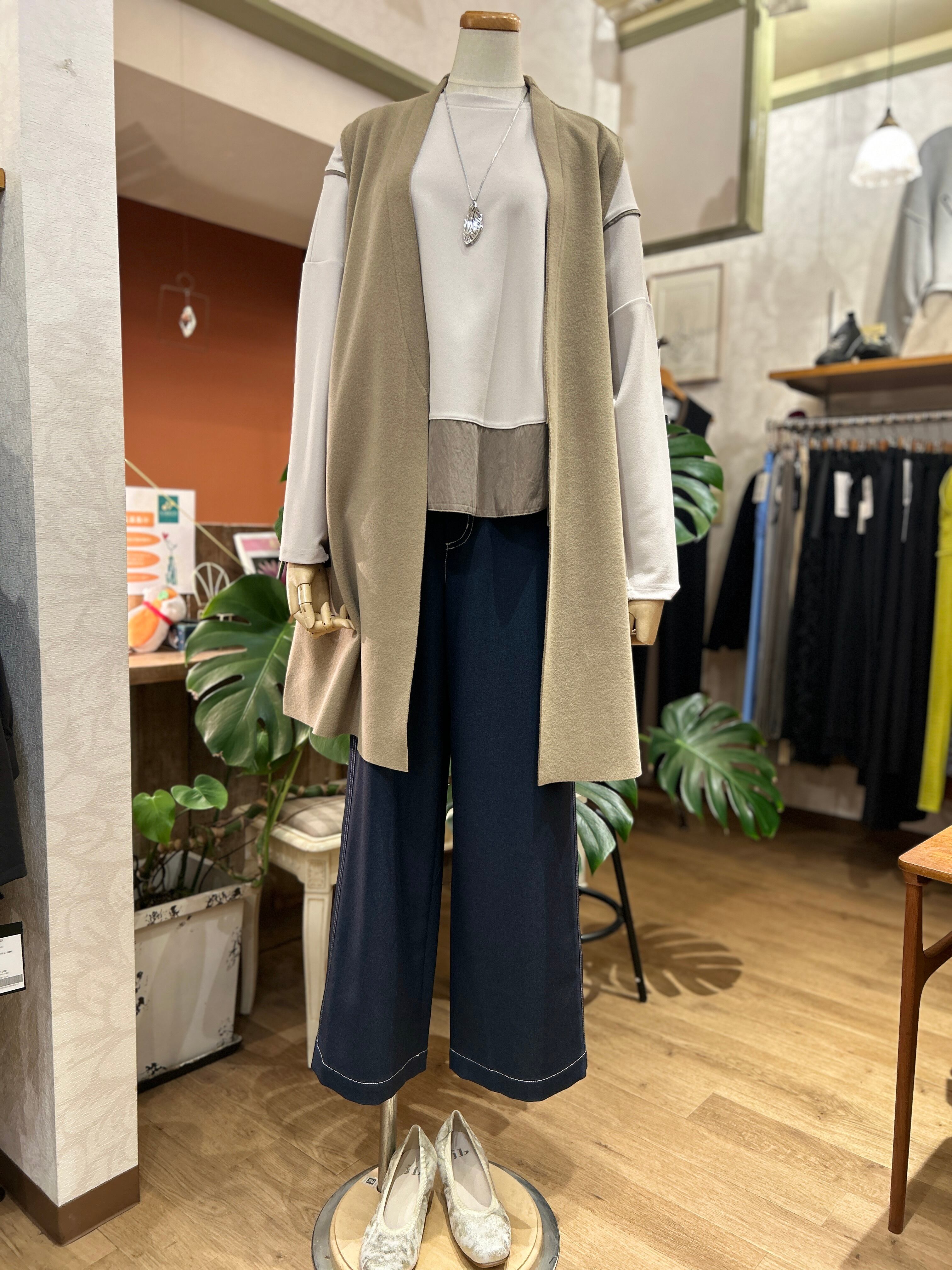 柔らかな着心地でリラックスしたスタイルを演出します。異素材で切り替えた裾、パイピングの配色がアクセント。