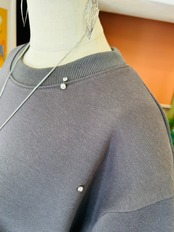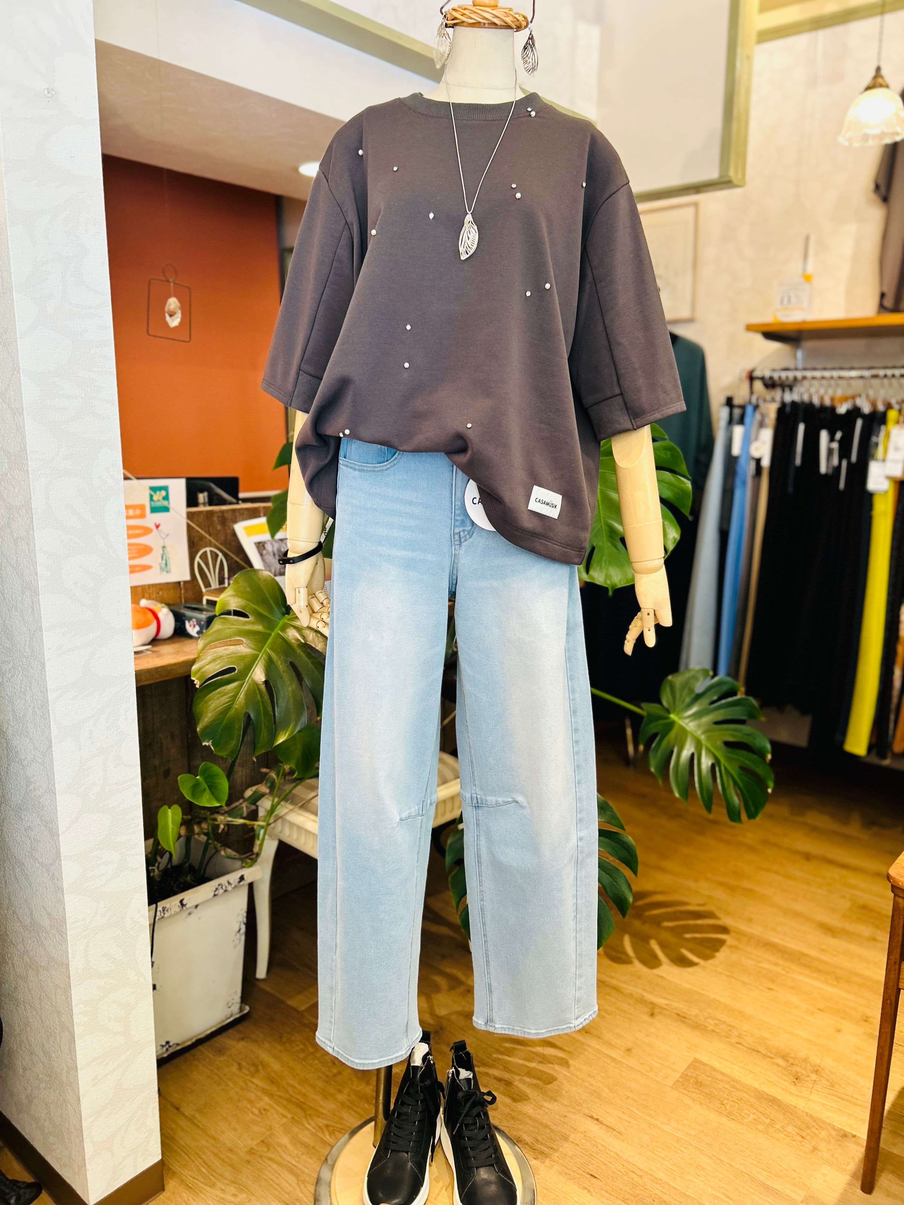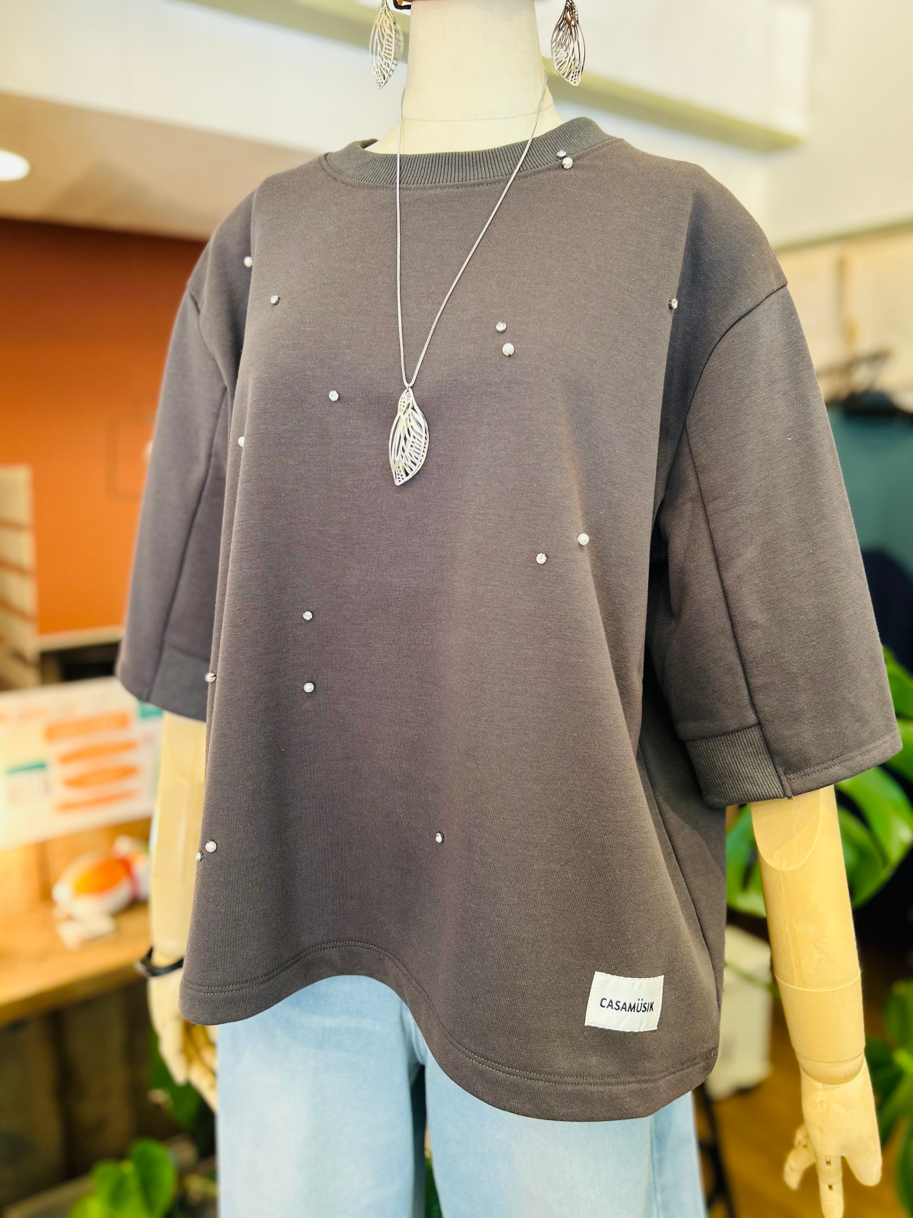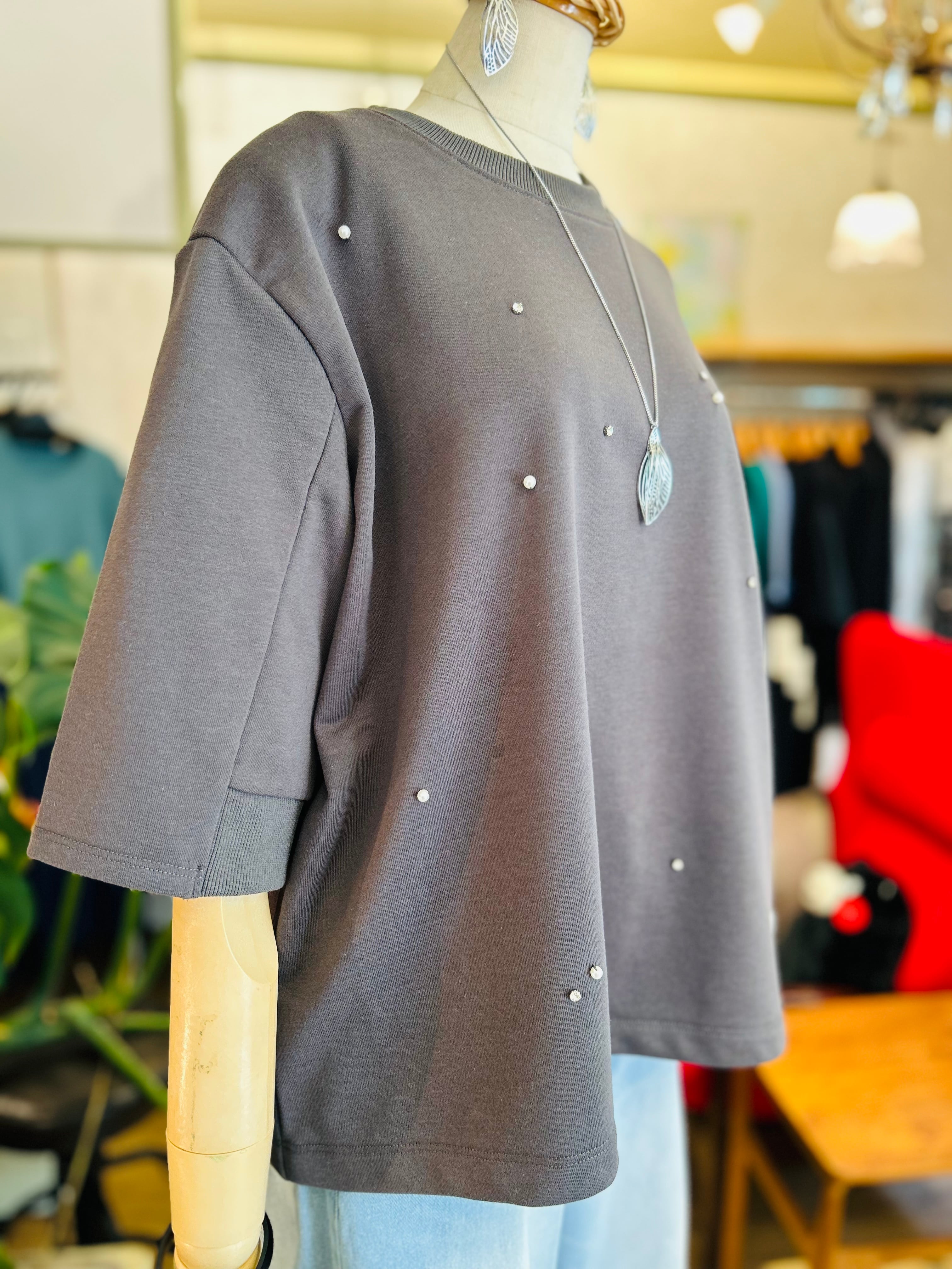 裏毛素材にランダムに散りばめられた小さなビジューやパールが、カジュアルの中にさりげない女性らしさを演出するトップス。