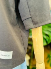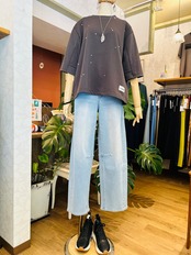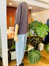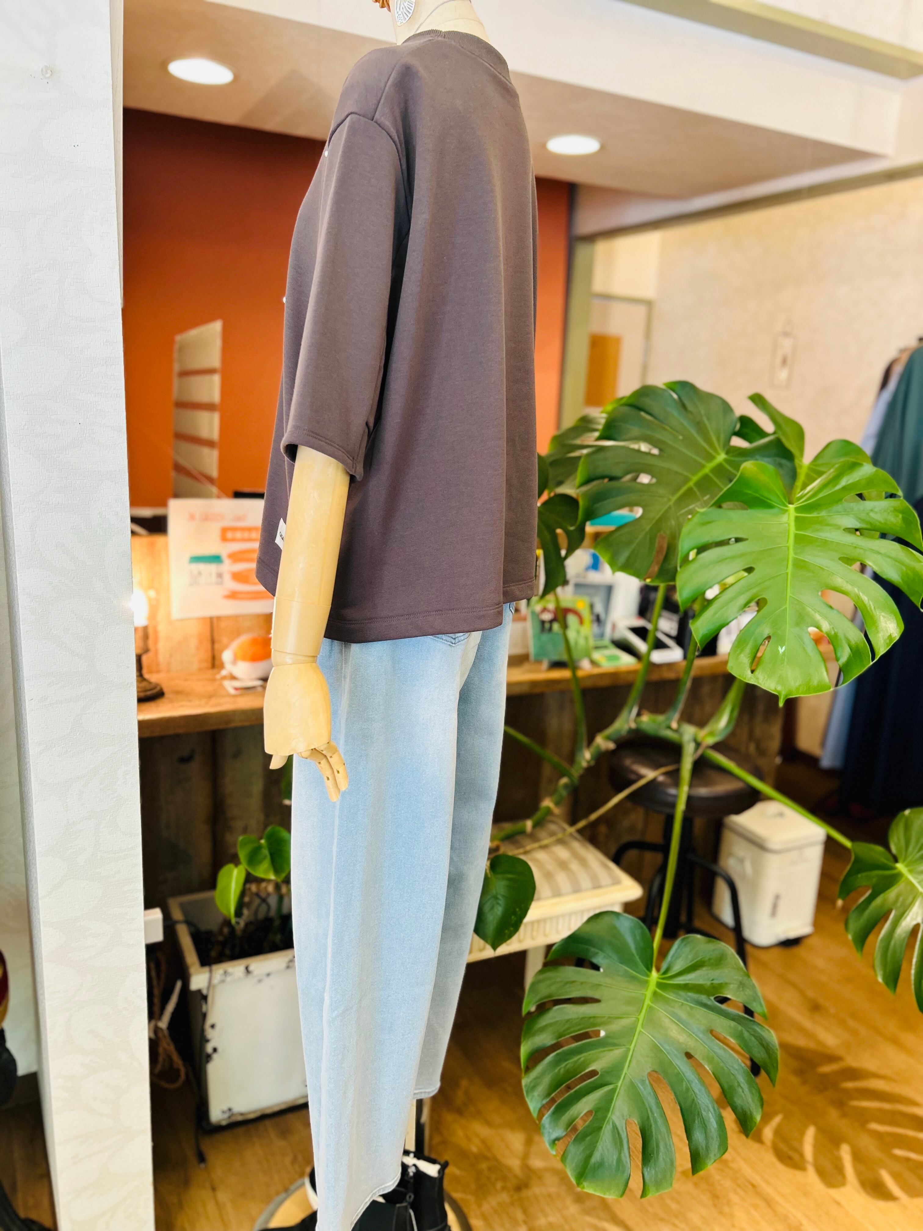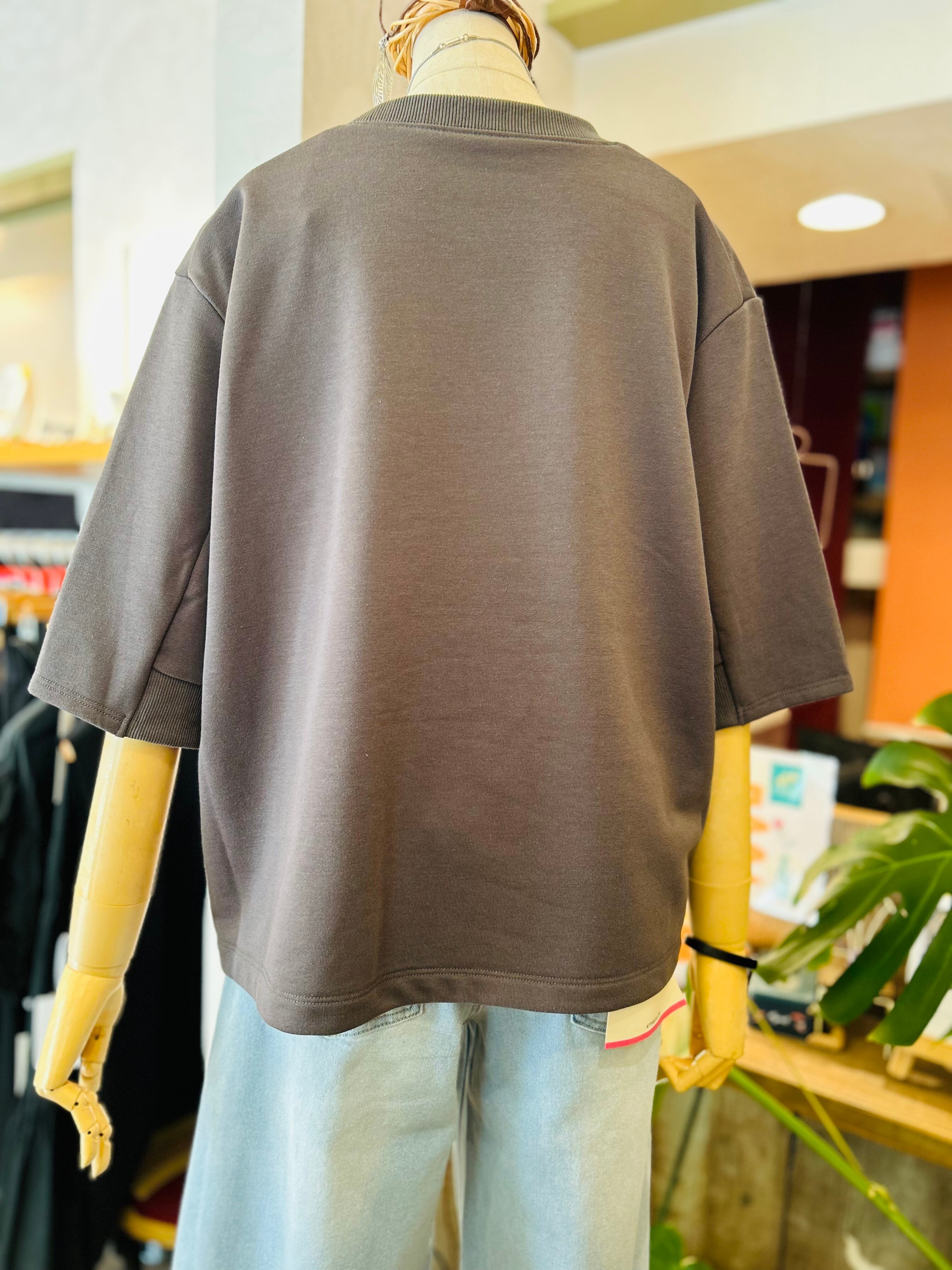 やや長めの半袖デザインで、一枚でさらっと着こなすのはもちろん、シャツを重ねるレイヤードスタイルもおすすめ。