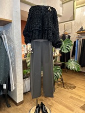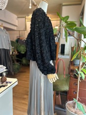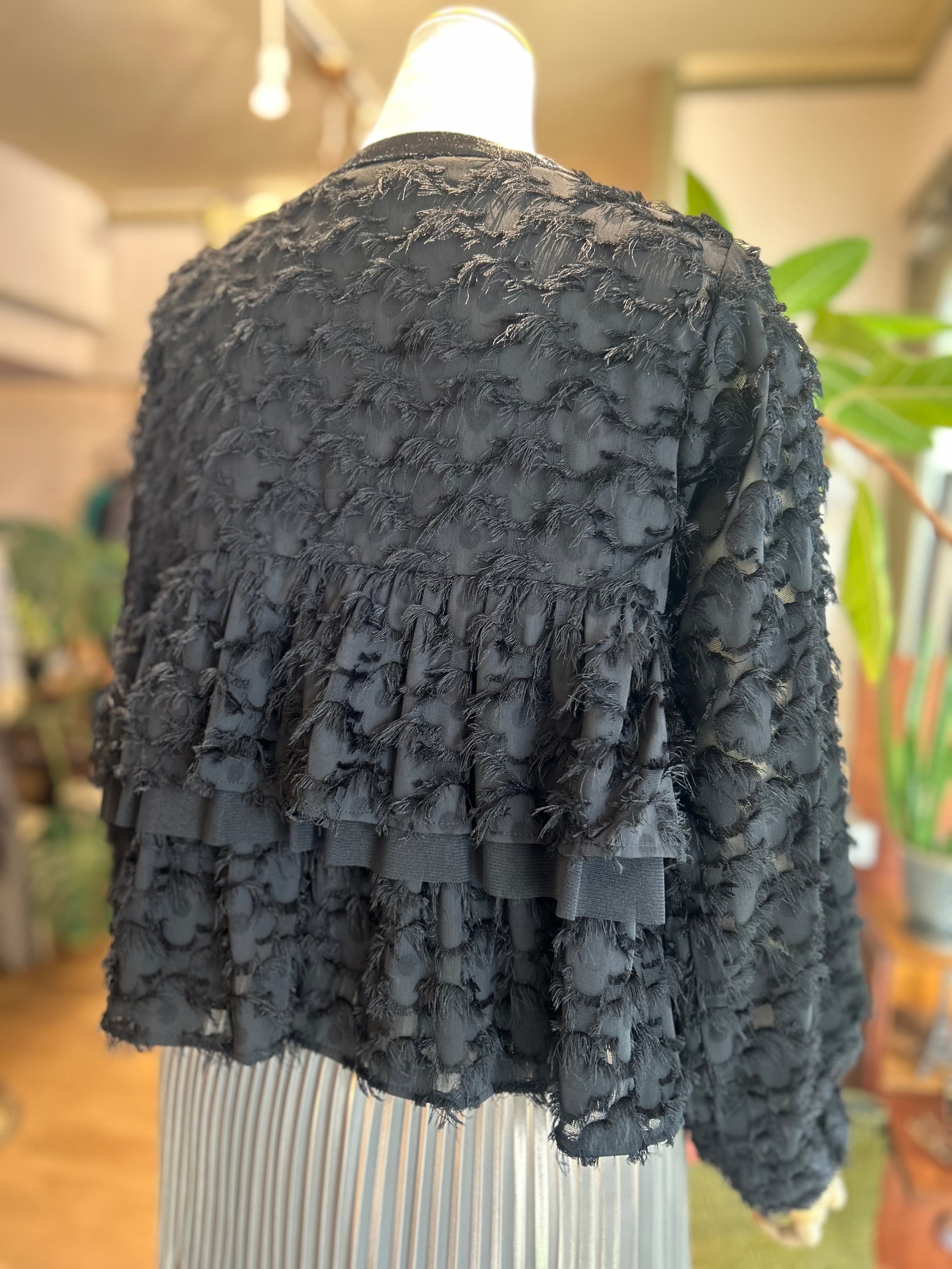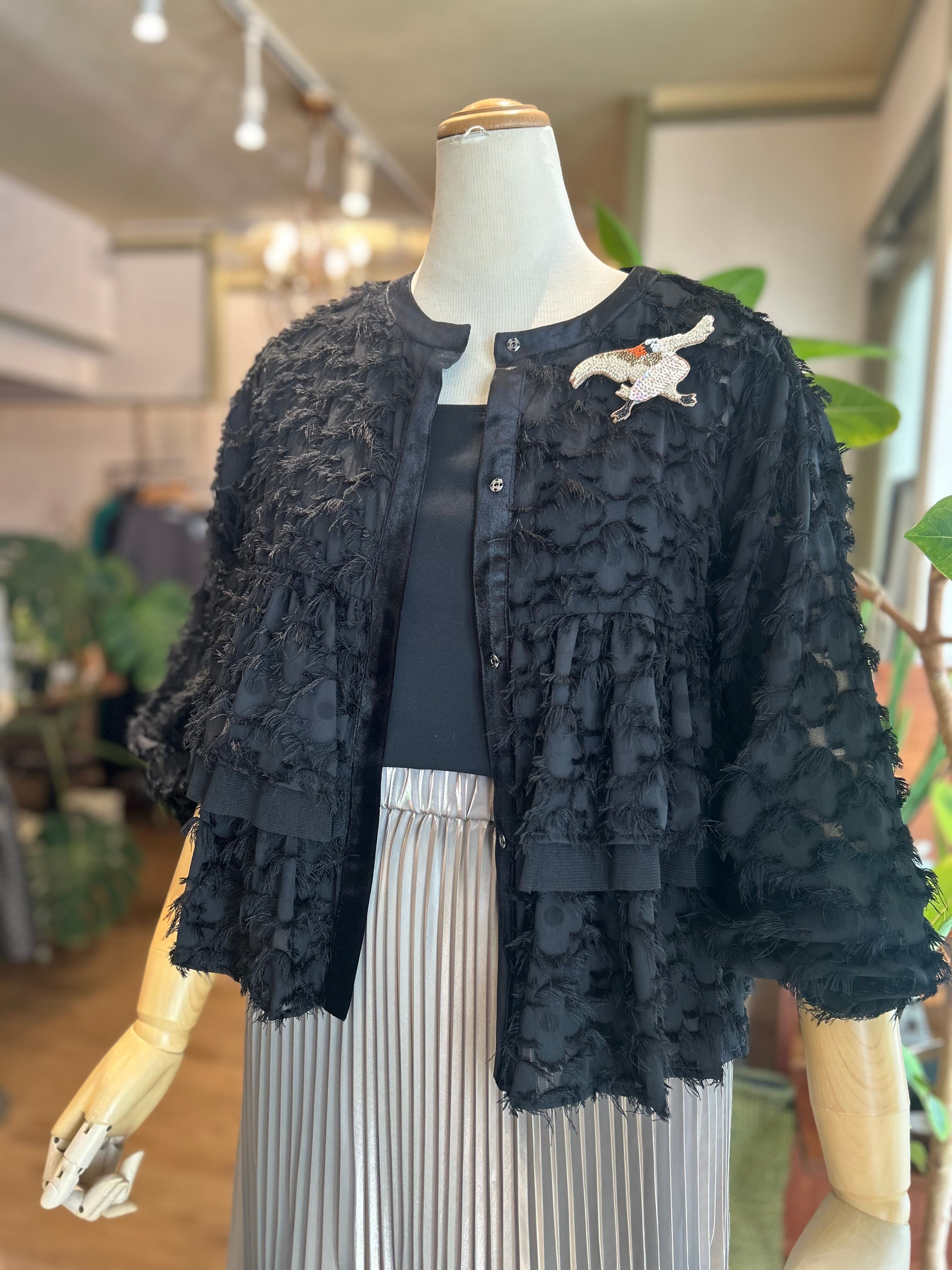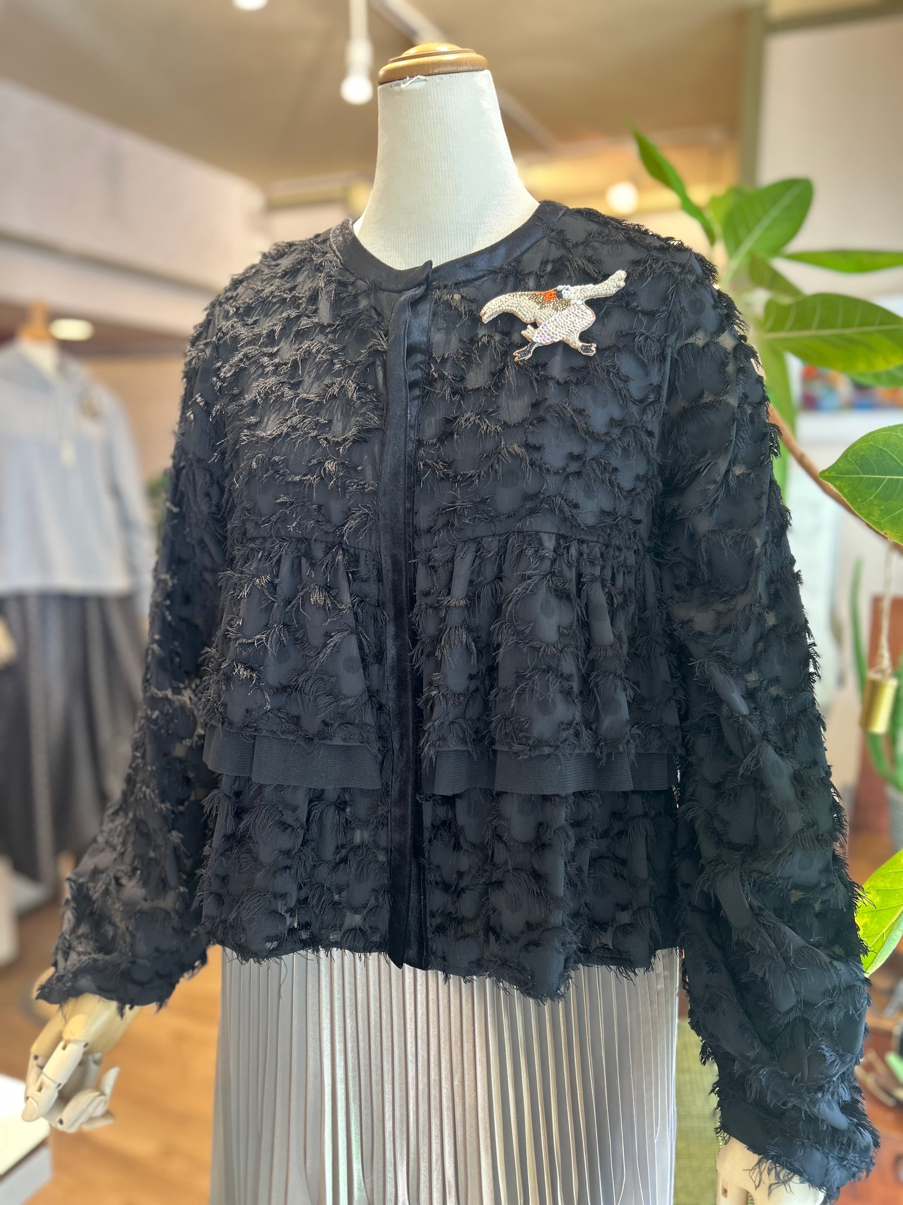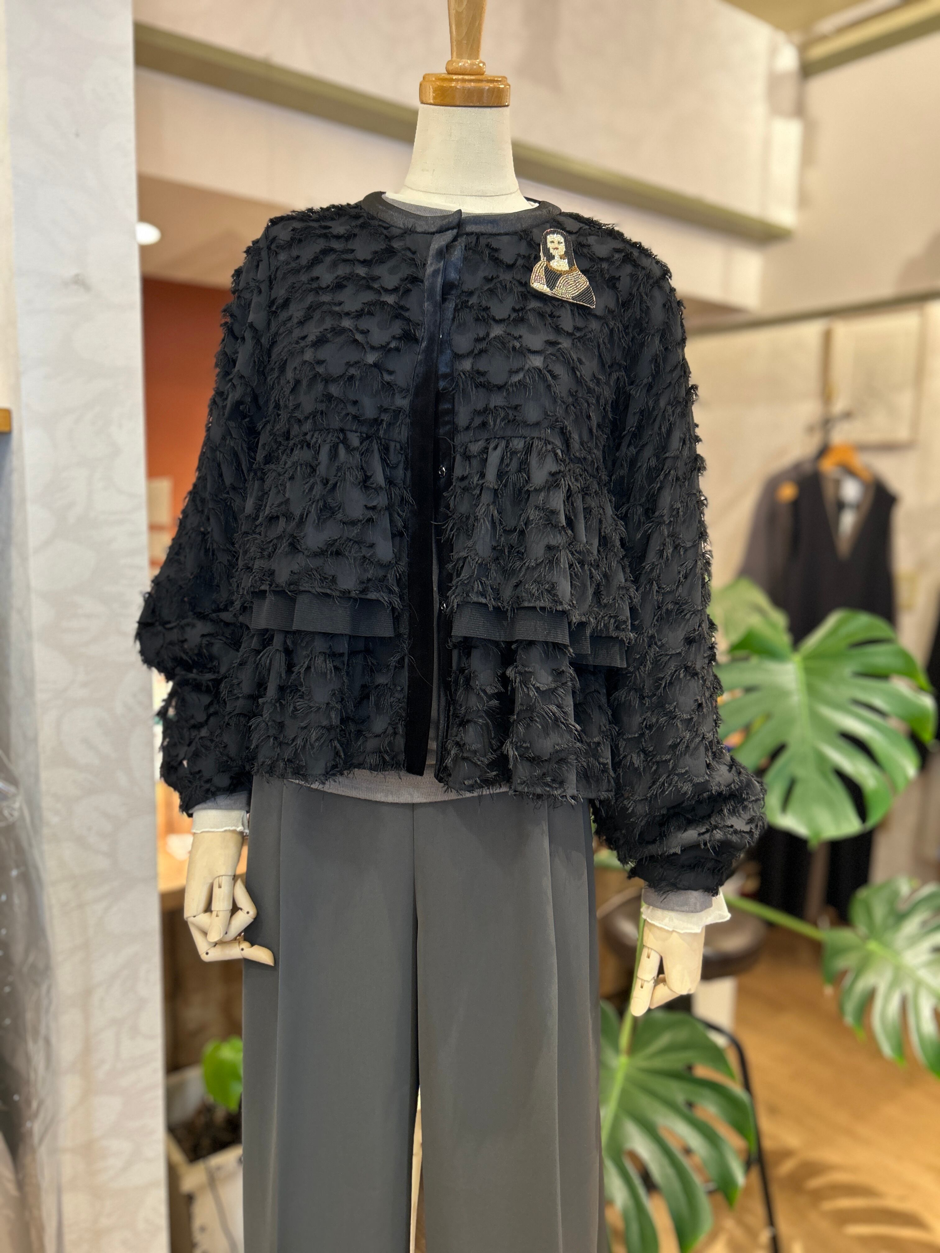 繊細な表情をもつカットジャガード生地に、軽やかなティアードディテールを重ねたブラウスです。甘くなりすぎない絶妙なバランス◎。前開き仕様なので、ブラウスとしても羽織としても使える2WAY タイプ。