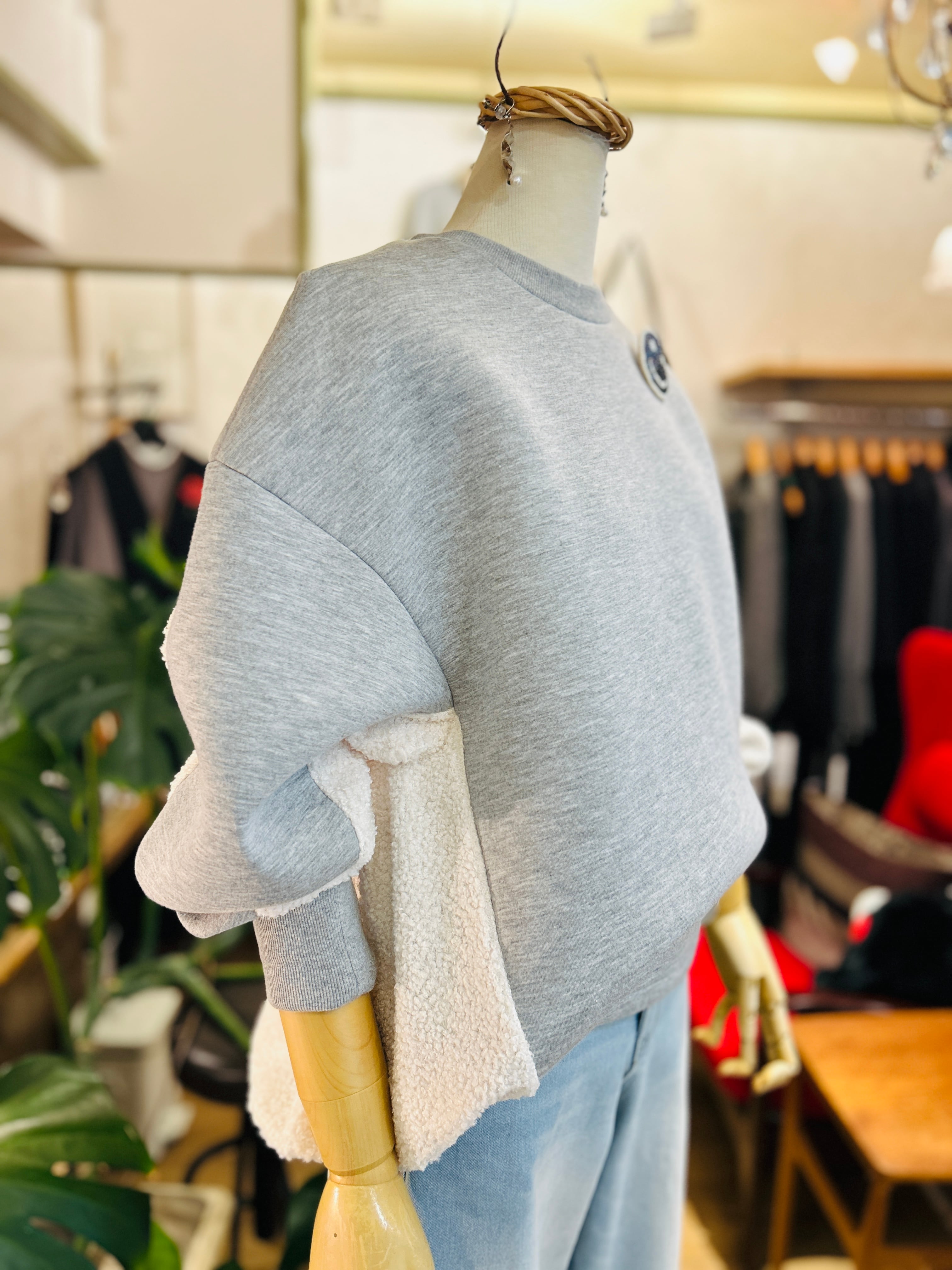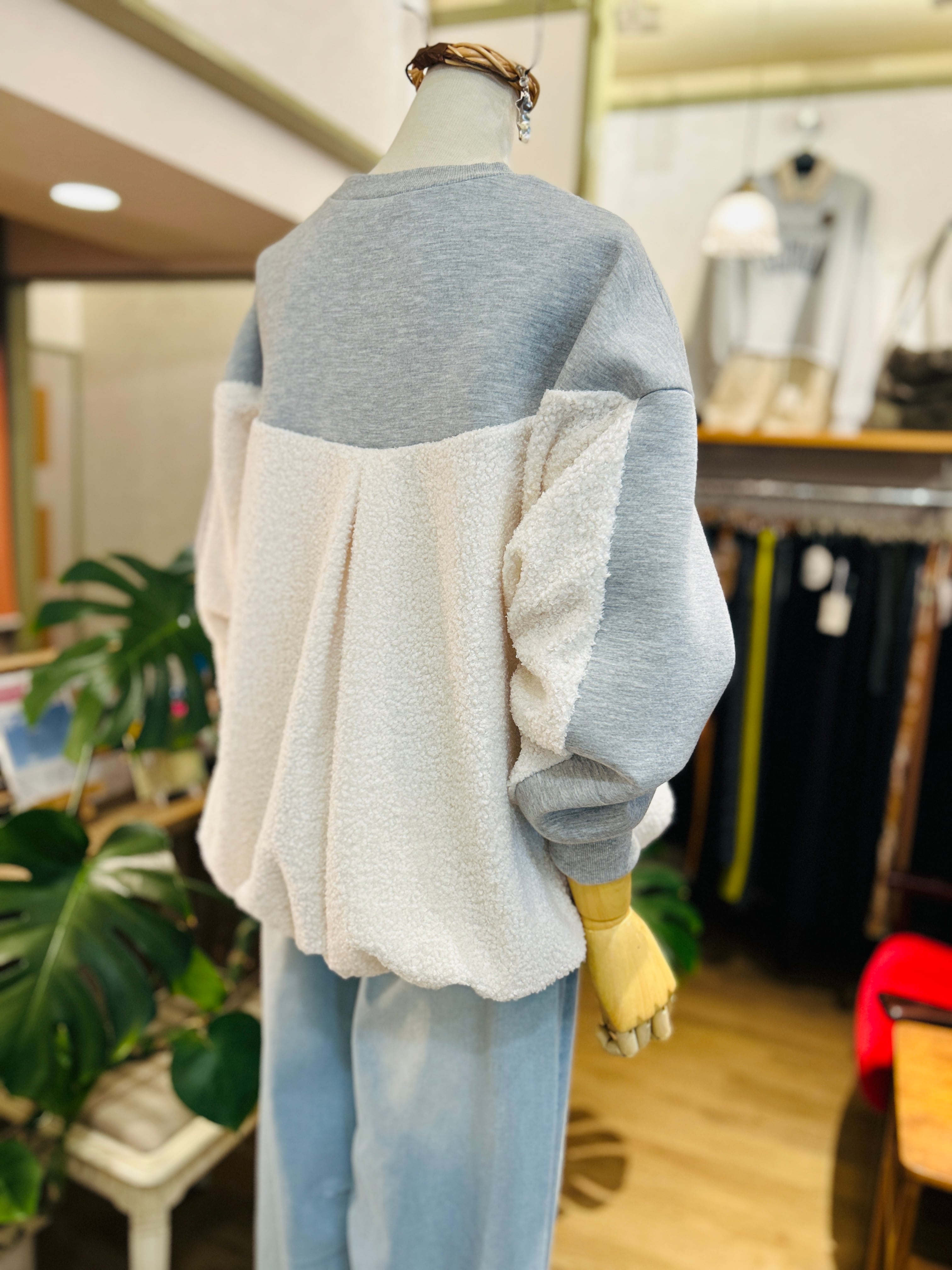 秋口に活躍するダンボール素材のトップスに、トレンドのボア素材をドッキング。