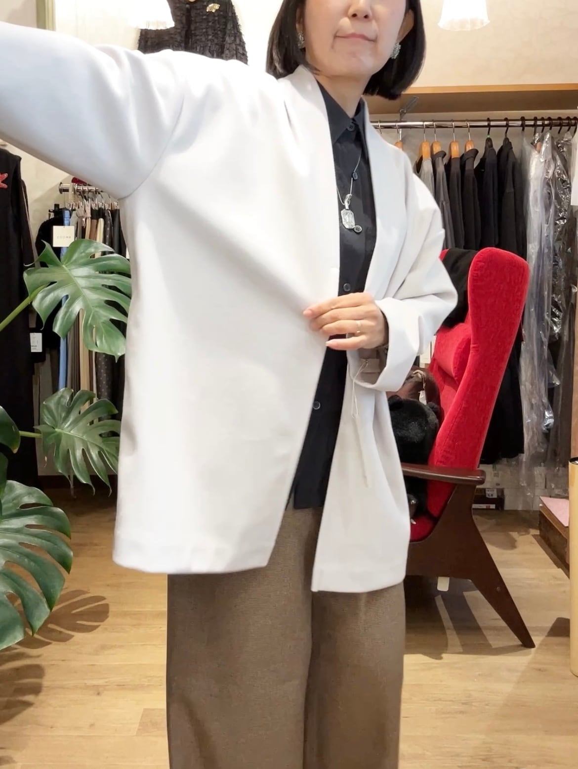 優れた保温性を持ちながら、軽やかな着心地が特徴です。フロントの開き具合やシルエットは、デイリーユースはもちろん、ちょっとしたお出かけにも最適。さまざまなスタイルに合わせやすいデザインで、気軽に羽織れるアイテムです。
