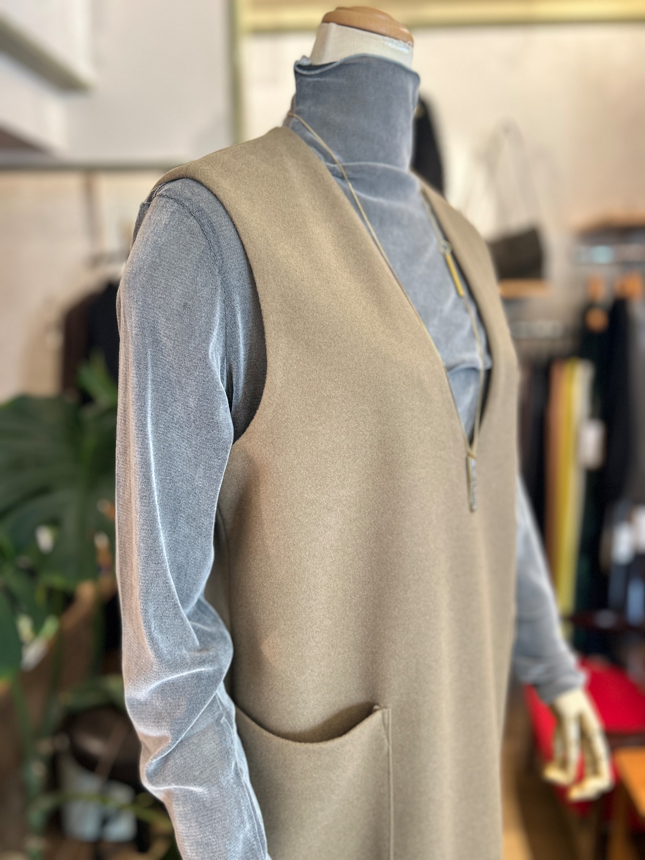 本物のウールよりちょうどいい肉感で優れた保温性を持ちながら、軽やかな着心地が特徴です。写真はキャメル