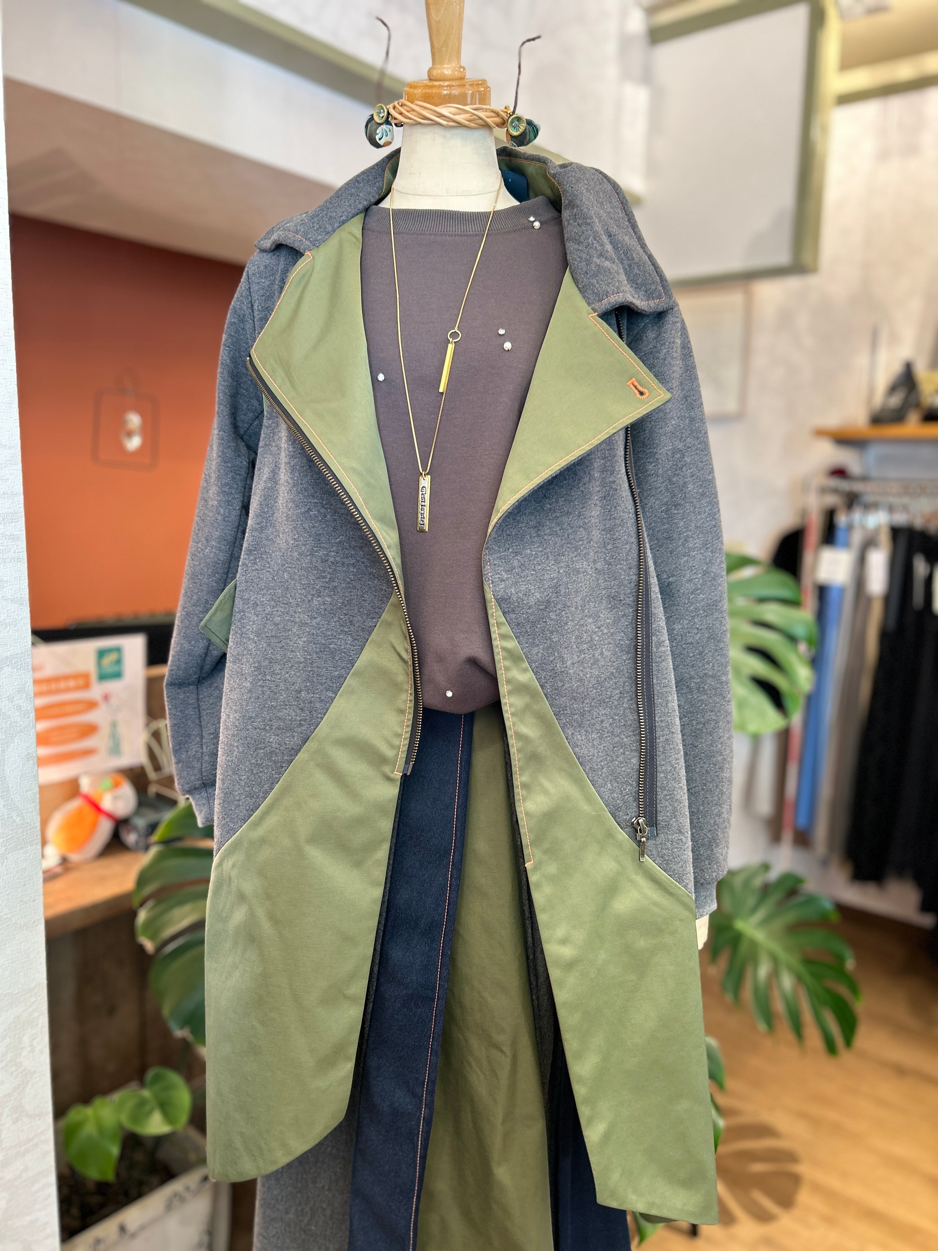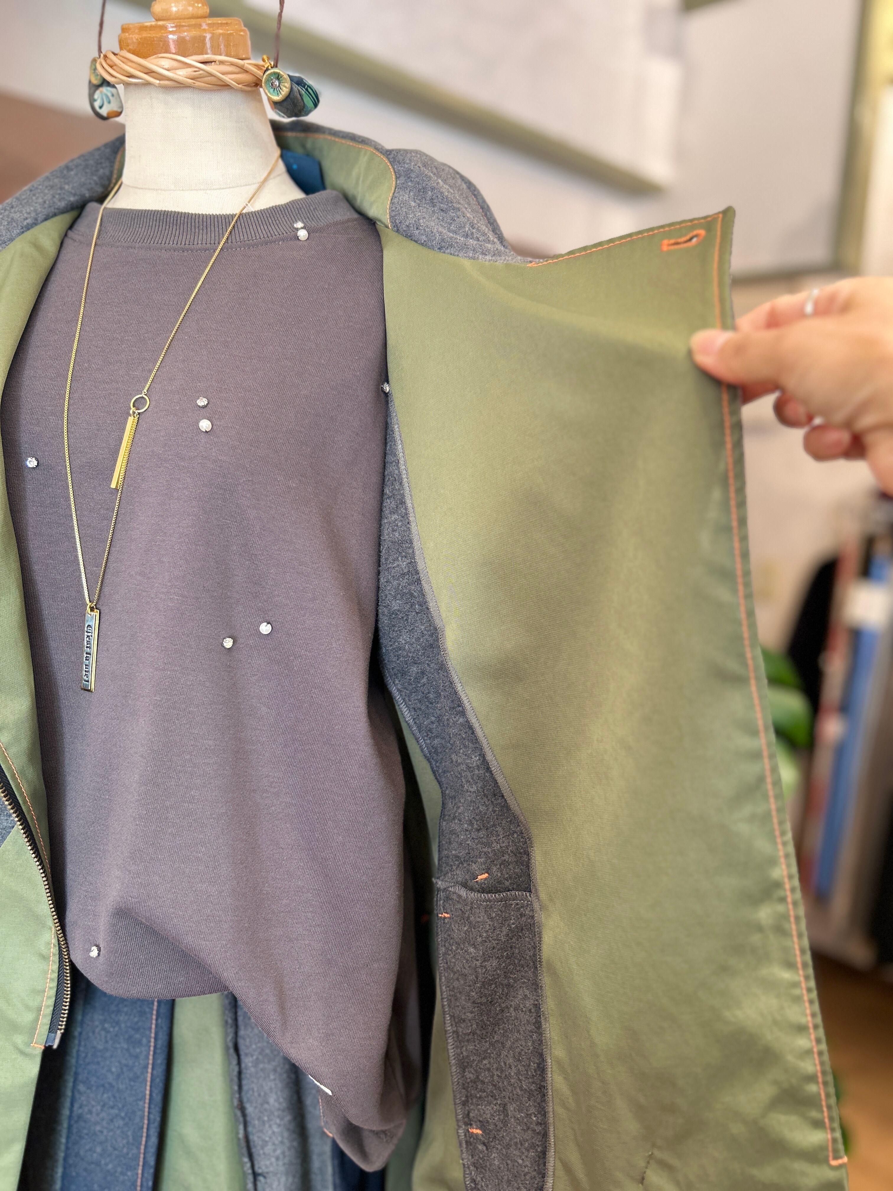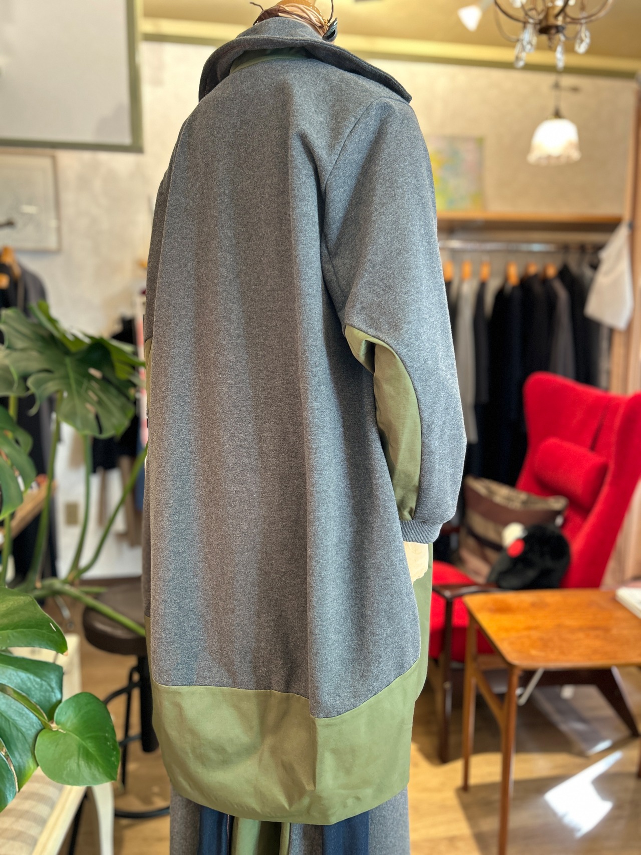 洗練された異素材の組み合わせで、トレンド感と個性を兼ね備えたロングコートです。 しっかりとしたウール素材と軽やかなポリエステルのタフタを結合し、上品なシルエットを実現。