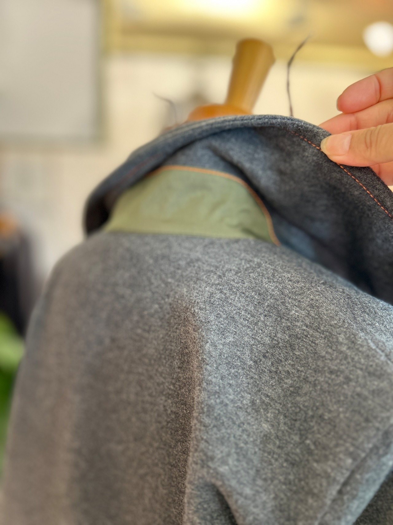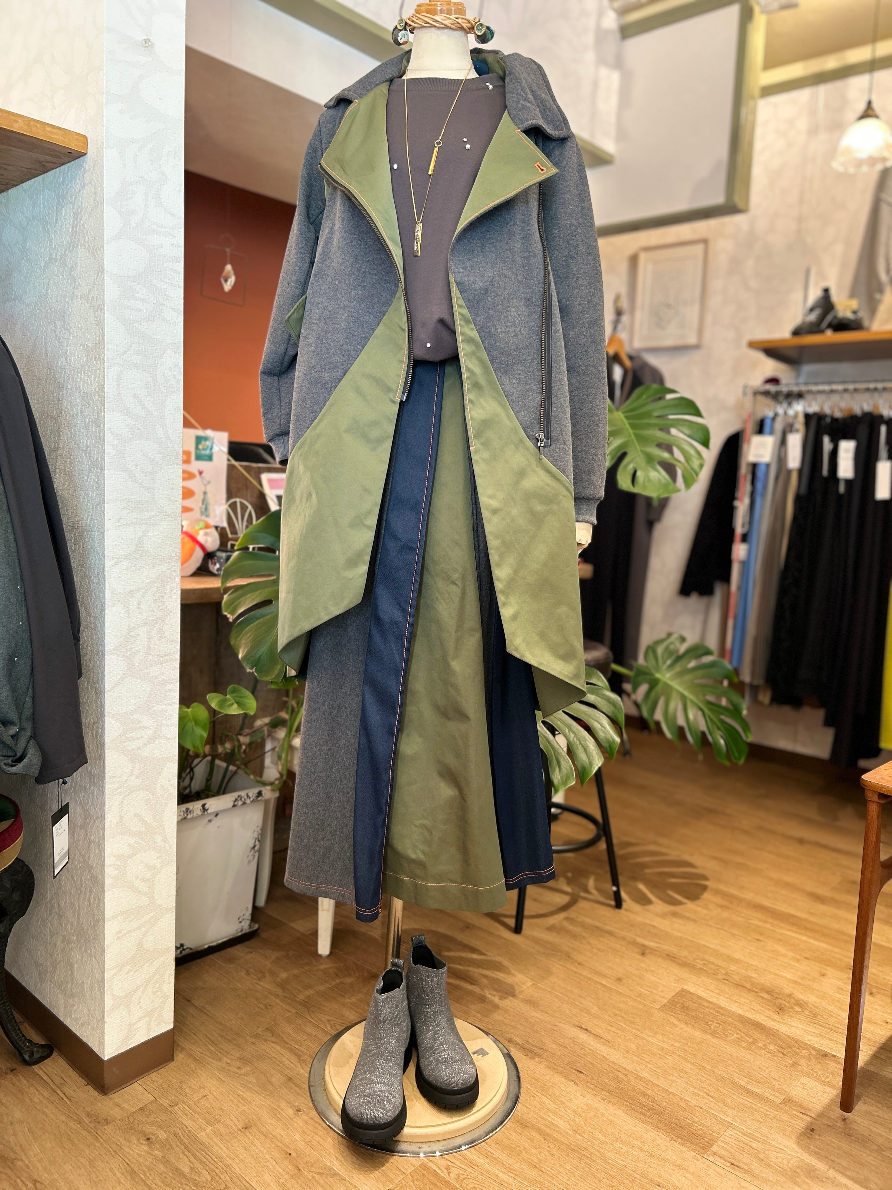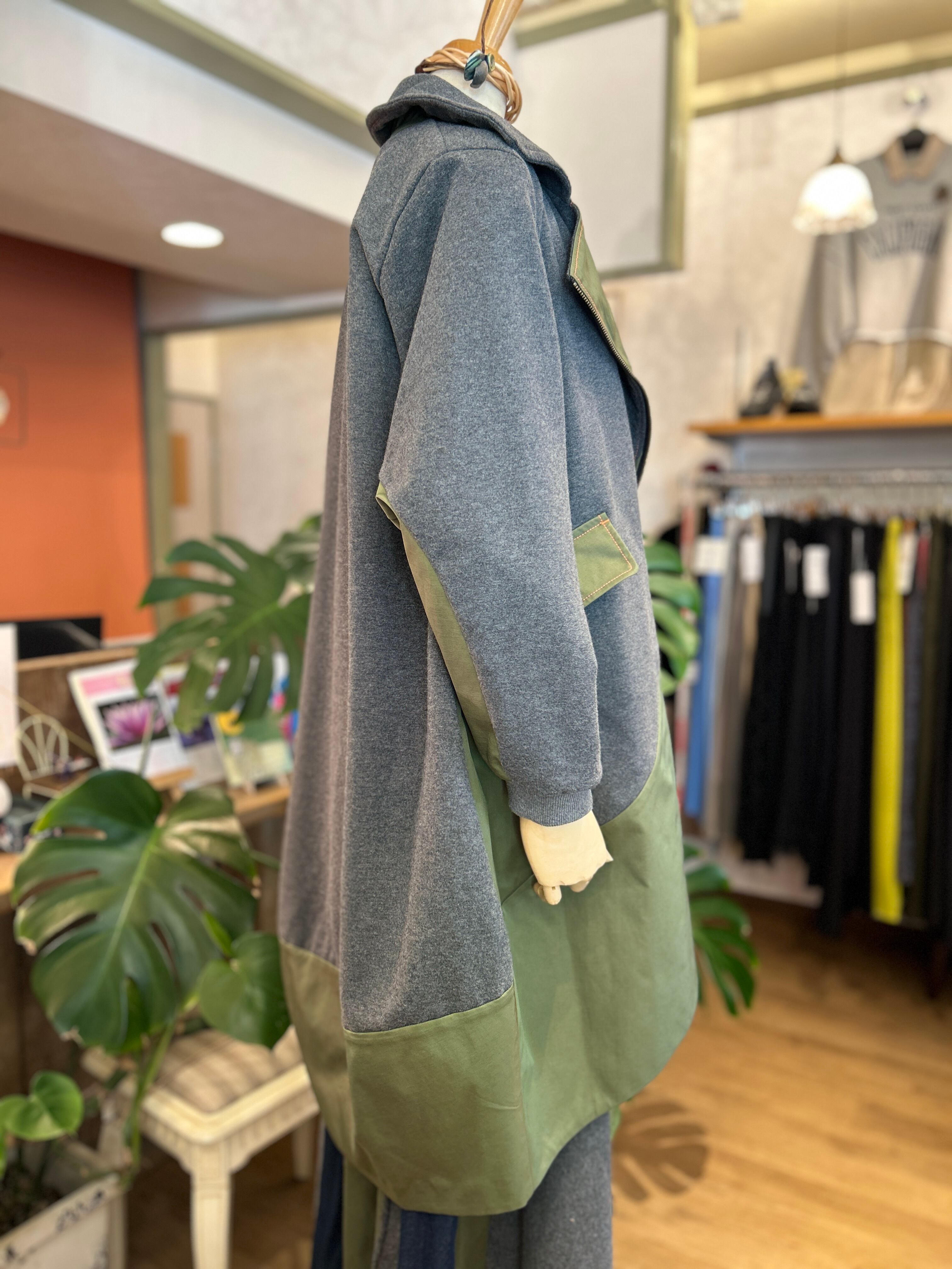 洗練された異素材の組み合わせで、トレンド感と個性を兼ね備えたロングコートです。 しっかりとしたウール素材と軽やかなポリエステルのタフタを結合し、上品なシルエットを実現。