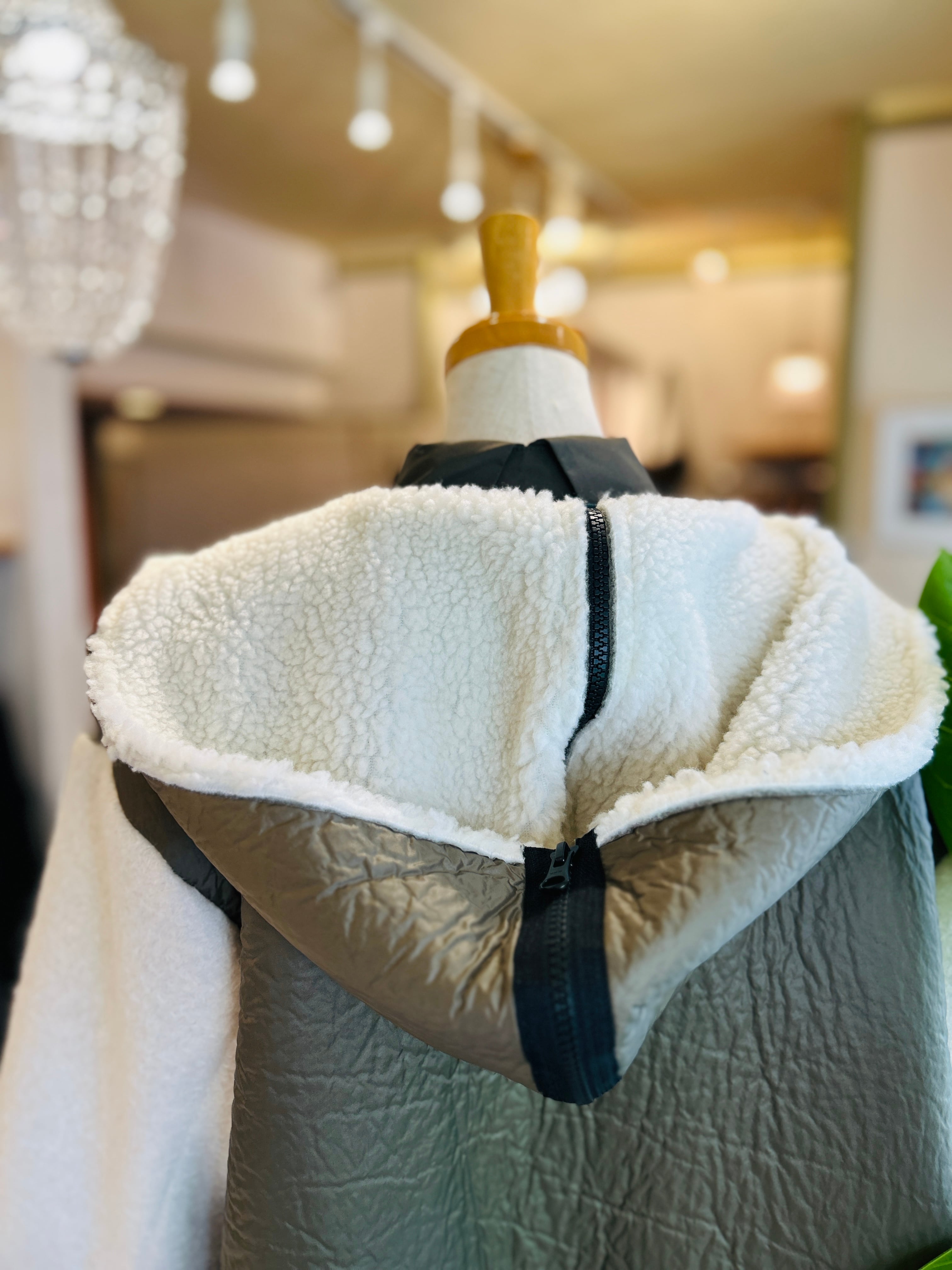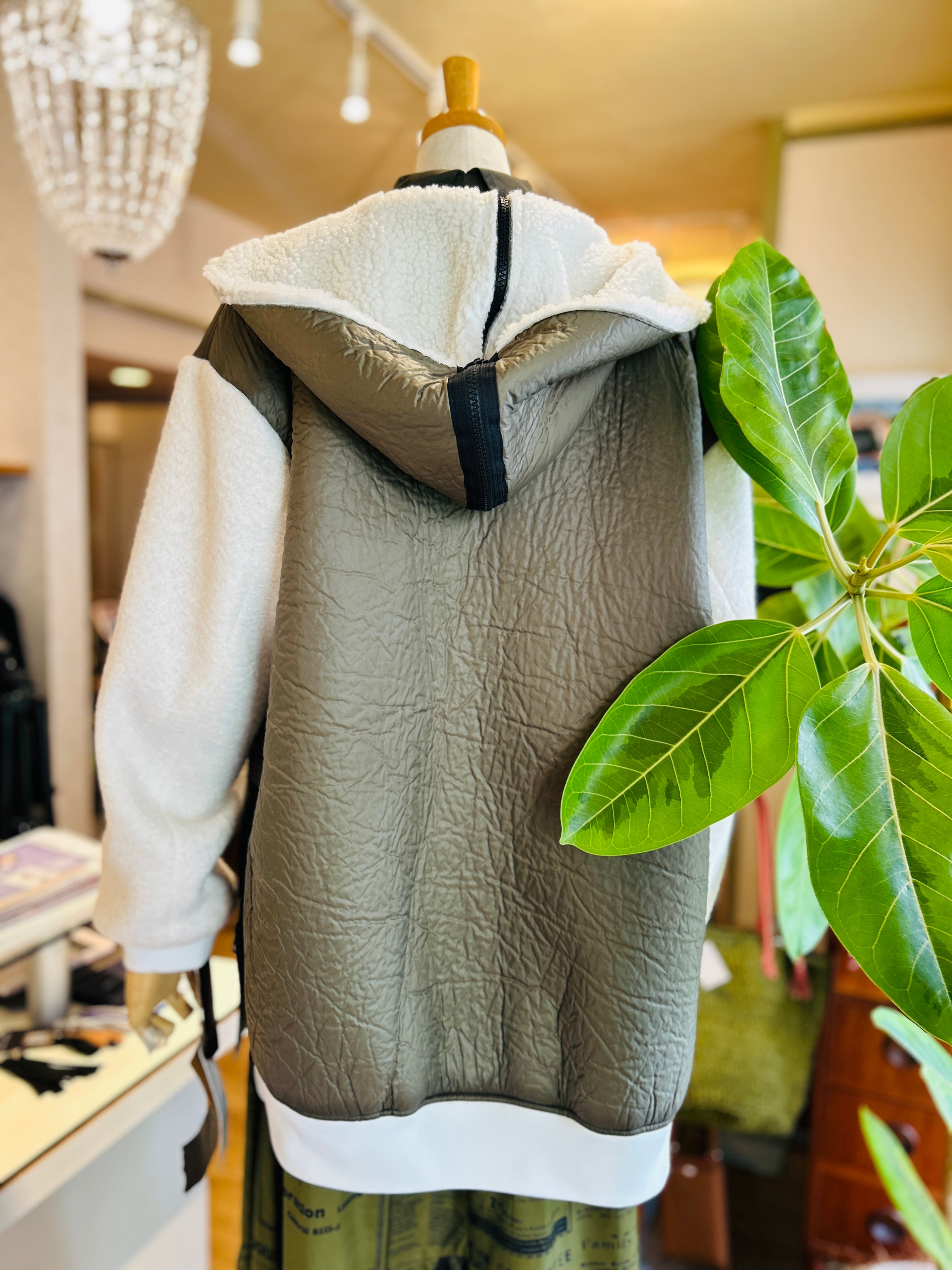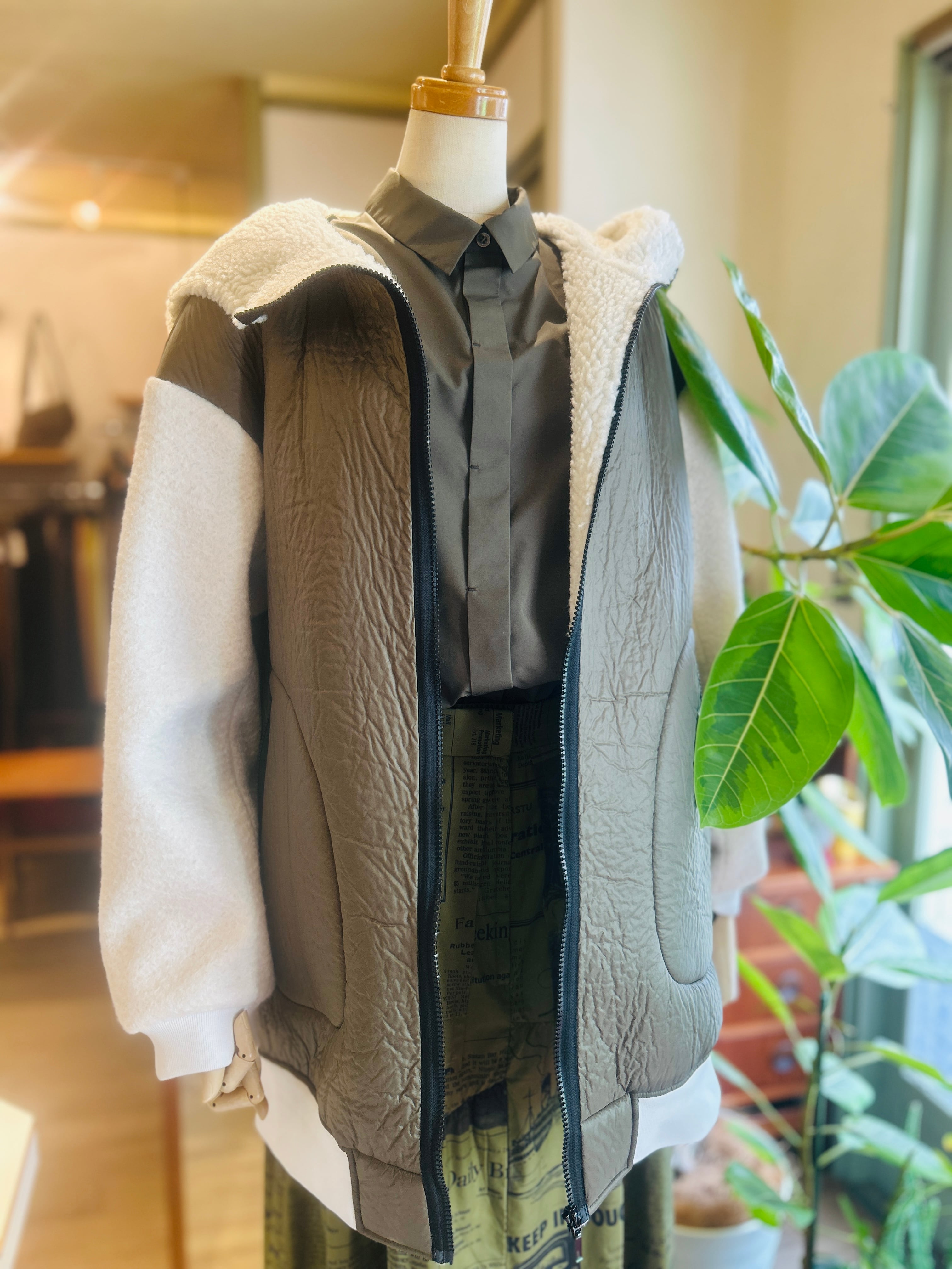 シンプルでありながら存在感のある、ミリタリーテイスト。 暖かなボア素材と耐久性のある生地を組み合わせており、寒い季節にも最適な一着。 デザインには、ユニークなポケットやフードがあり、実用性も兼ね備えています
