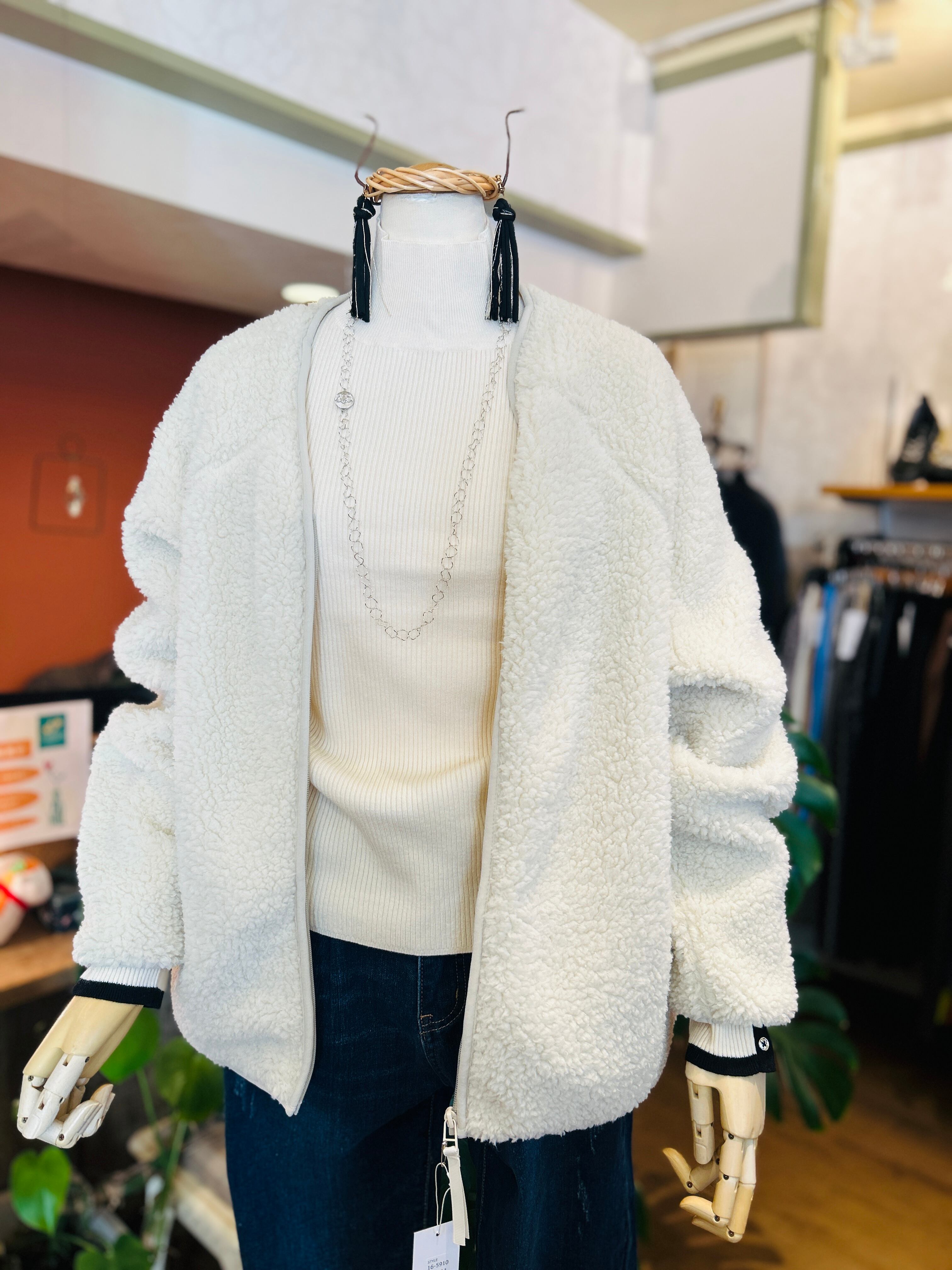 首元はVのノーカラー。首回りがすっきり見えして、レイヤードも楽しめます。タートルネックやブラウスなどレイヤード次第で表情を変えます。
