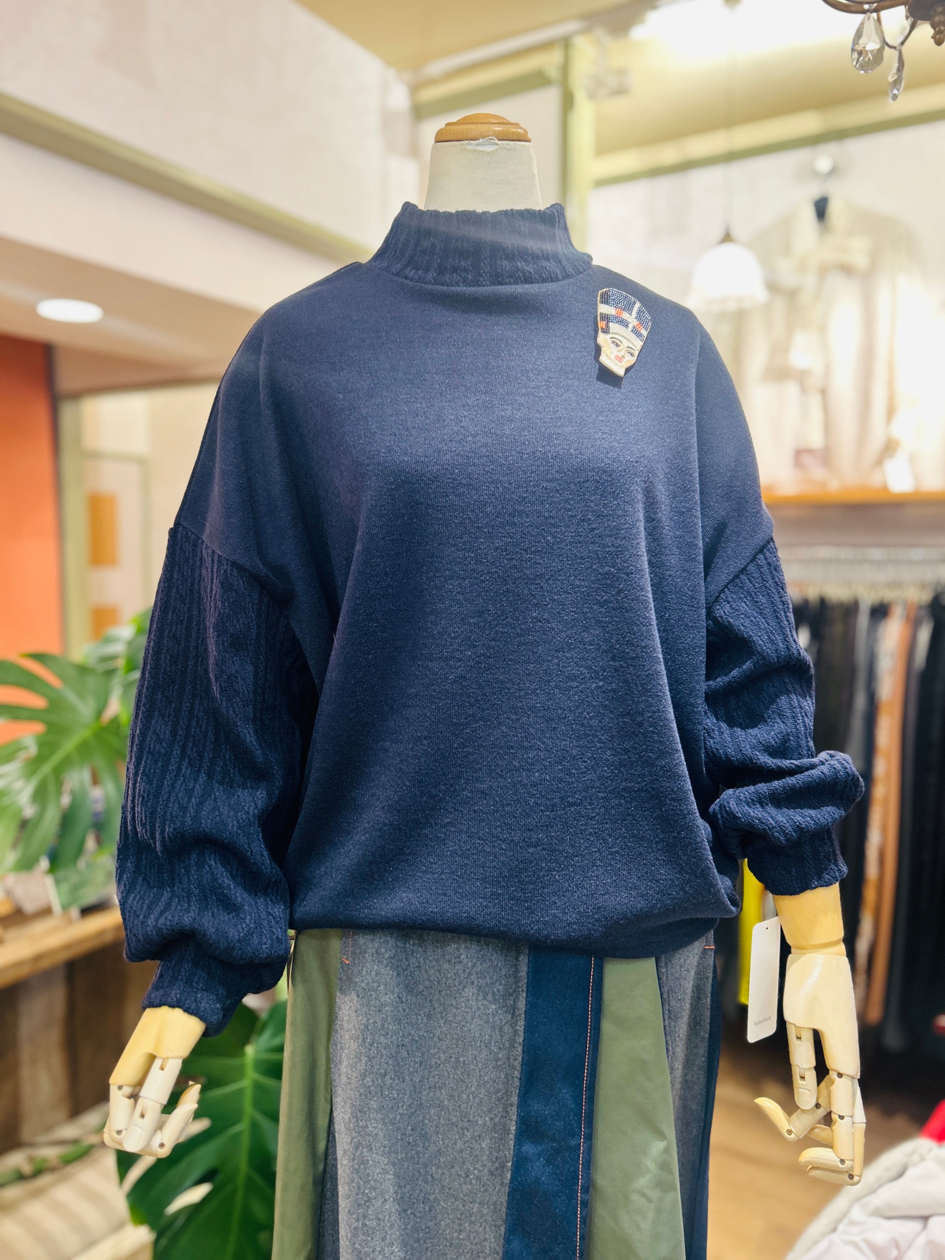 フロートステッチ編みの袖とハイネック