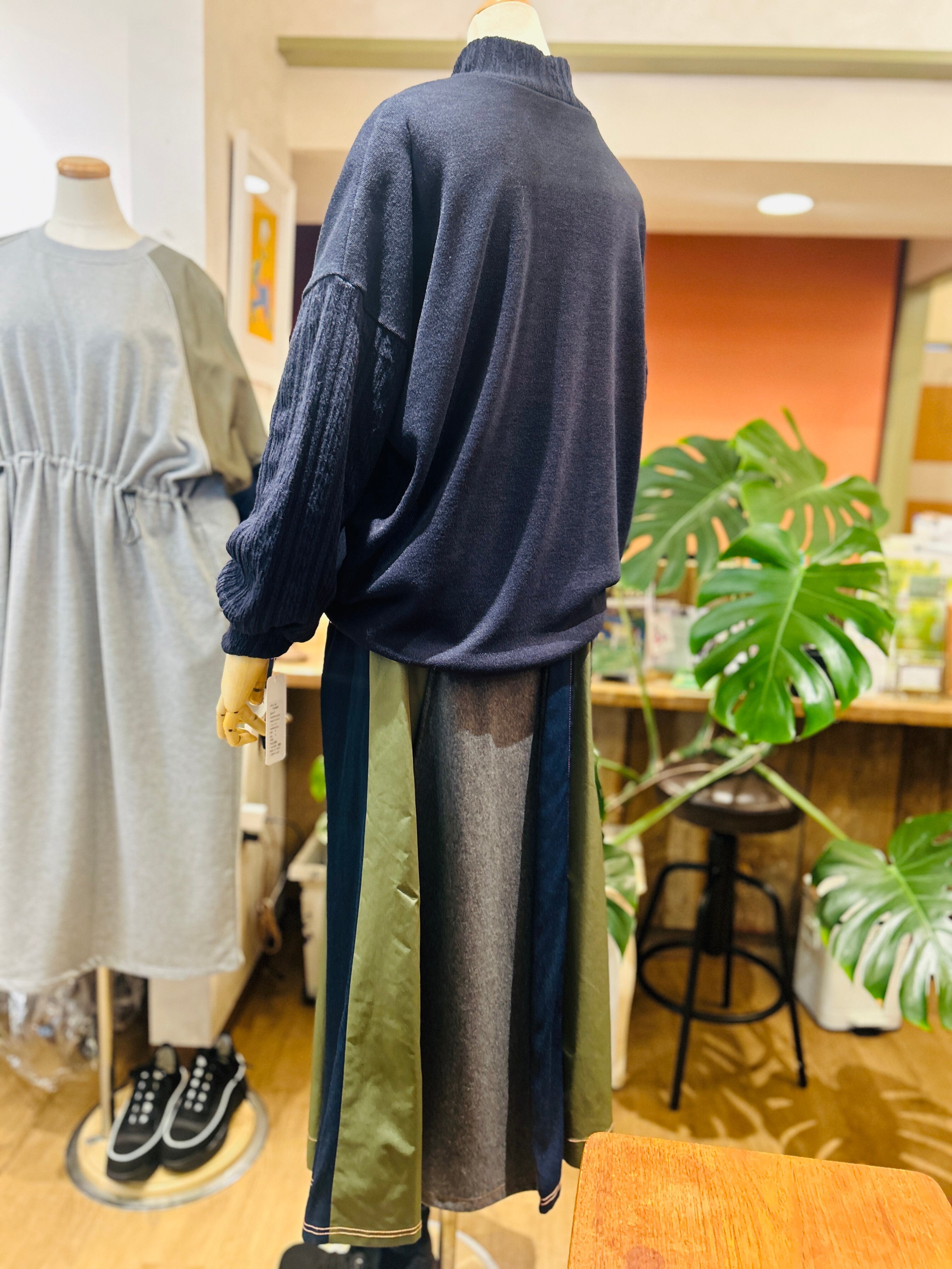 ゆったりとしたシルエットなので、デニムやスカートなど、様々な下半身アイテムと相性抜群。