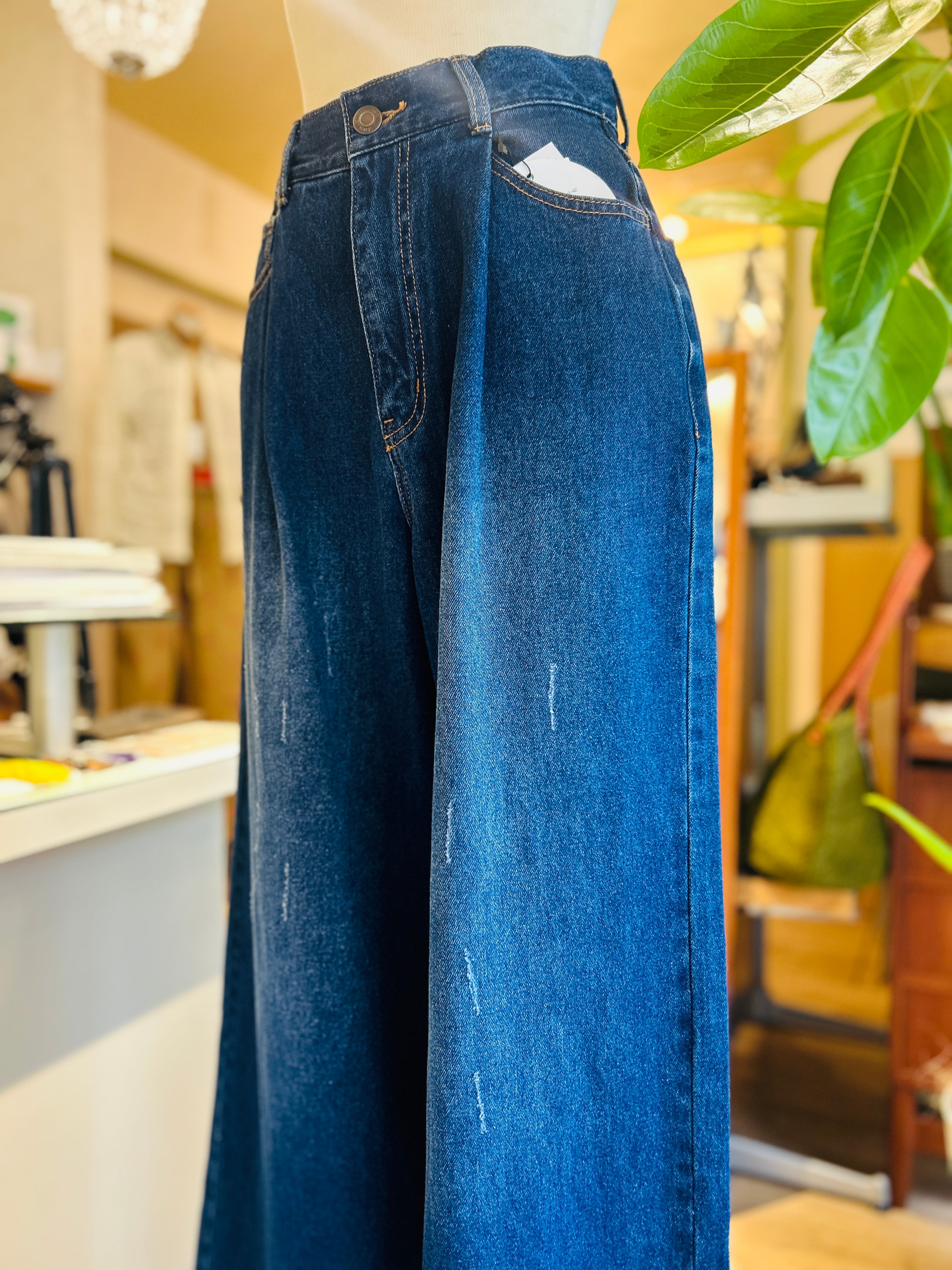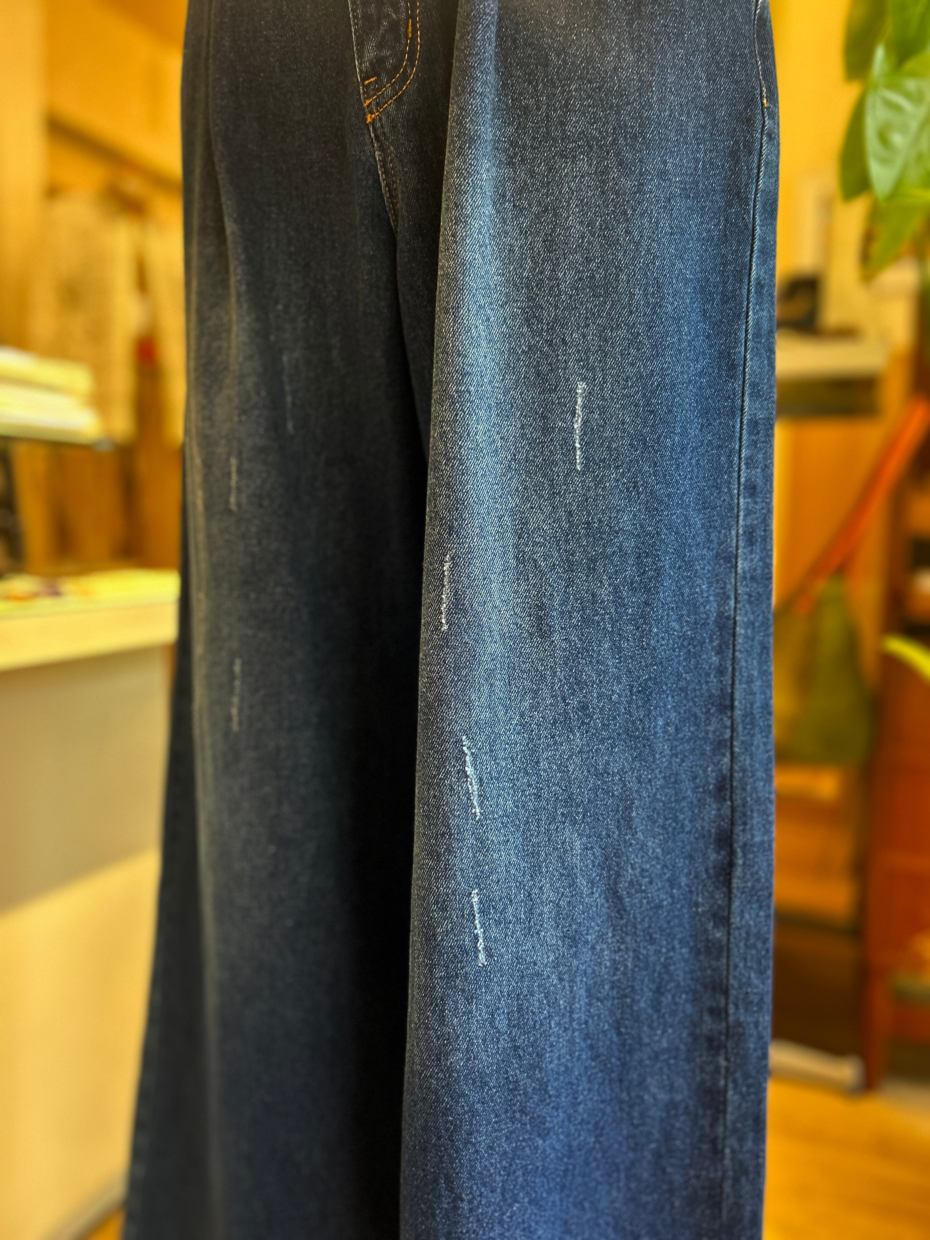 ひっかいたようなスクラッチダメージがアクセントになったデニムパンツ。