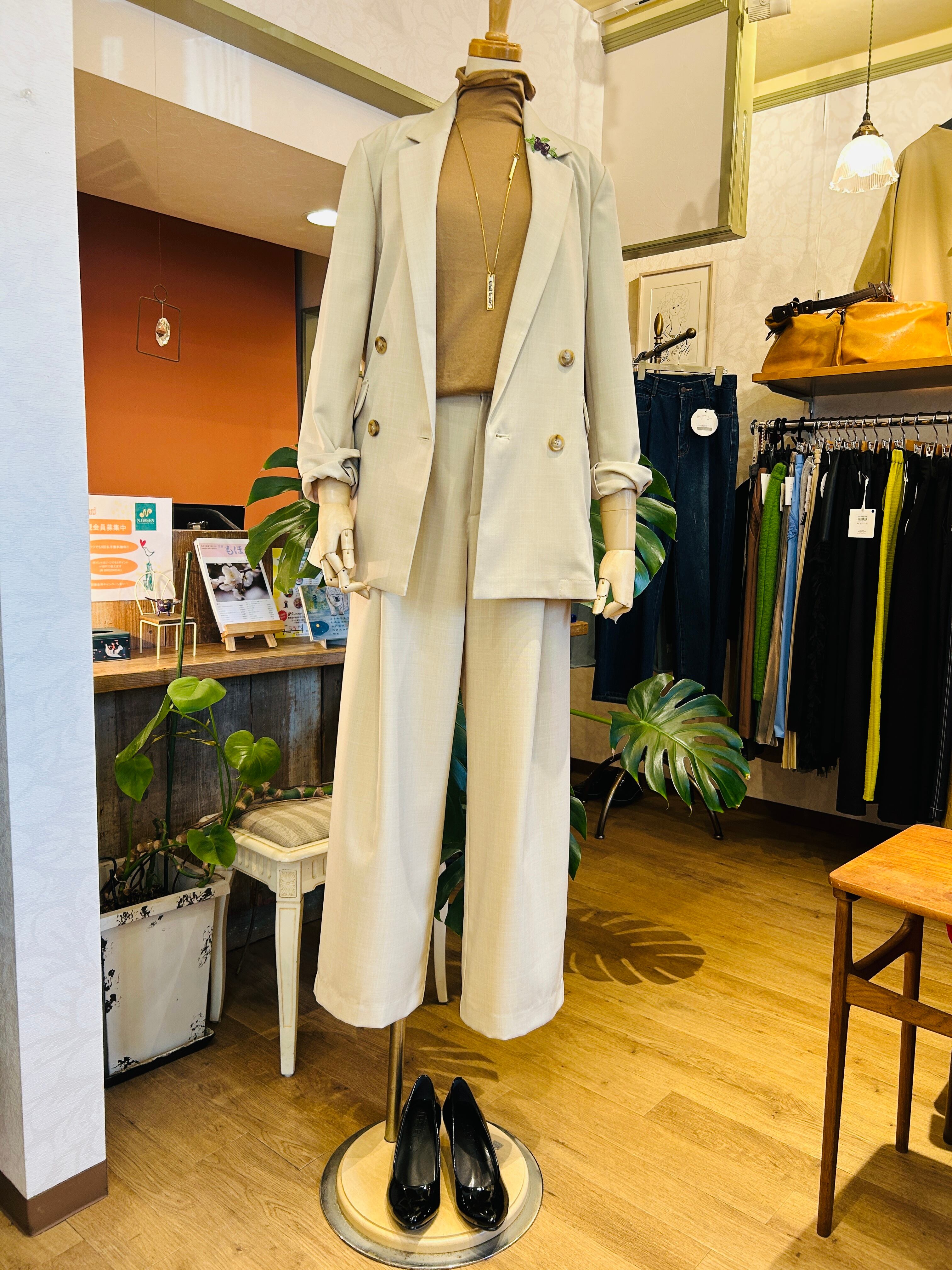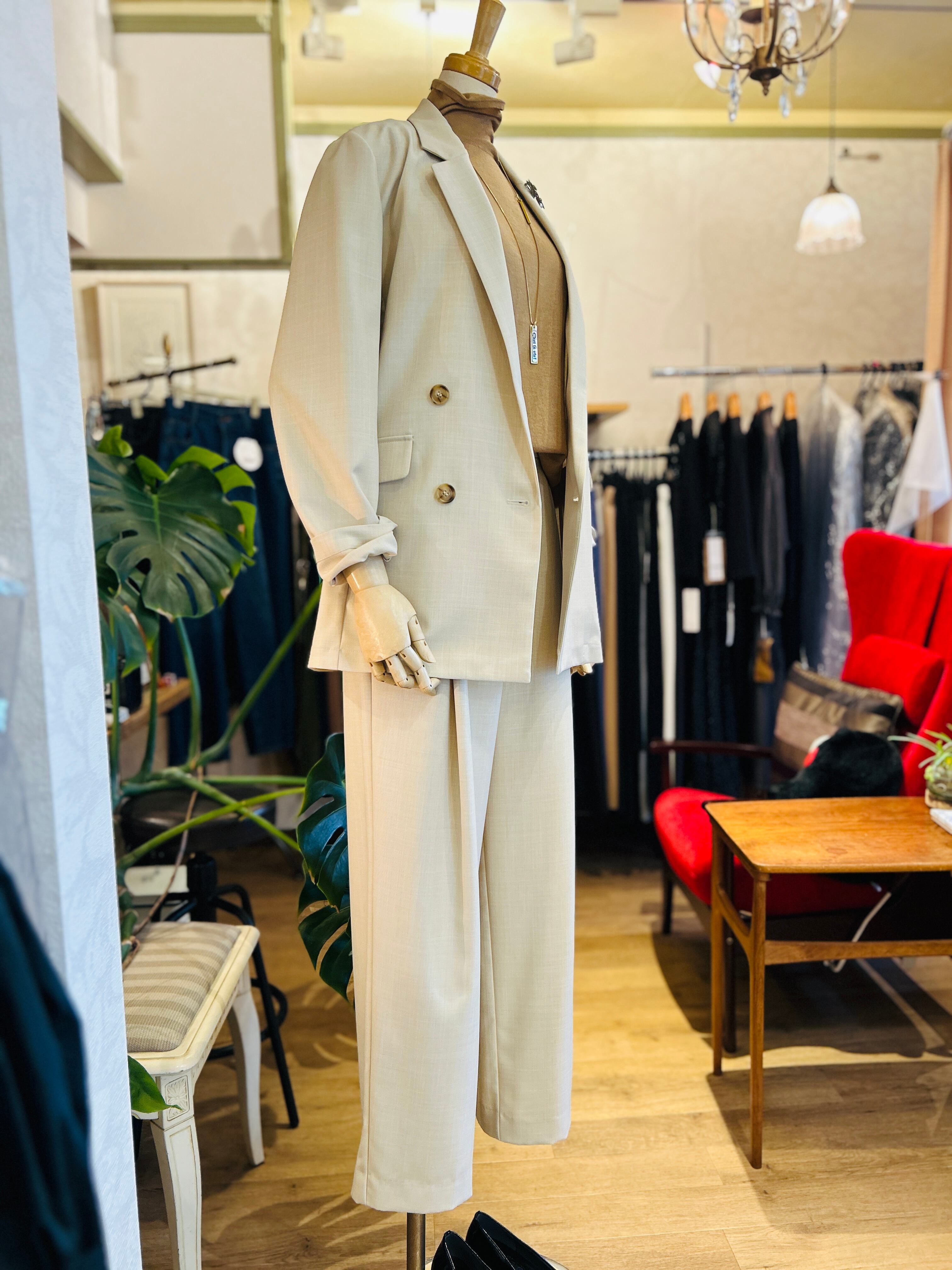 前身のダブル仕様とすっきりしたセットインスリーブでトレンド感のある着こなしを叶えてくれます。後身にはダブルプリーツを施し女性らしさをプラス。同素材パンツとのセットアップもおすすめです。